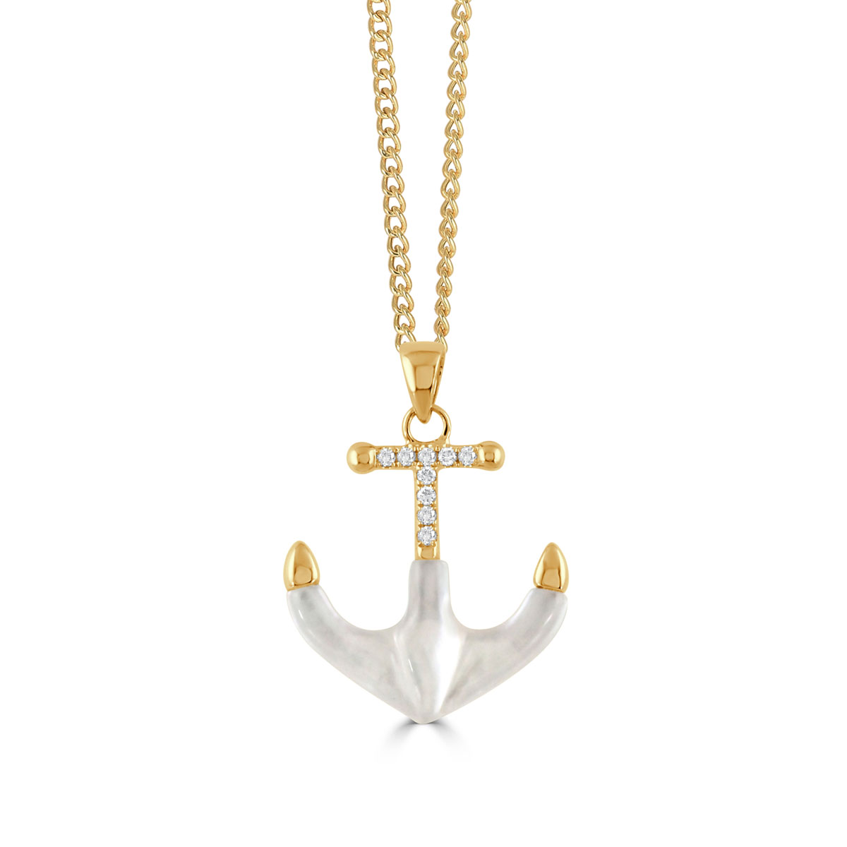 18K YELLOW GOLD DIAMOND ANCHOR PENDANT WITH CLEAR QUARTZ OVER WHITE MOTHER OF PEARL D9=.14 CQ/WMP=3.56